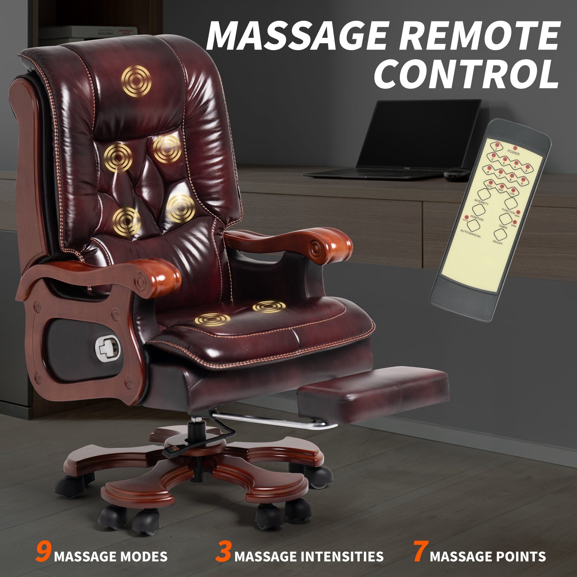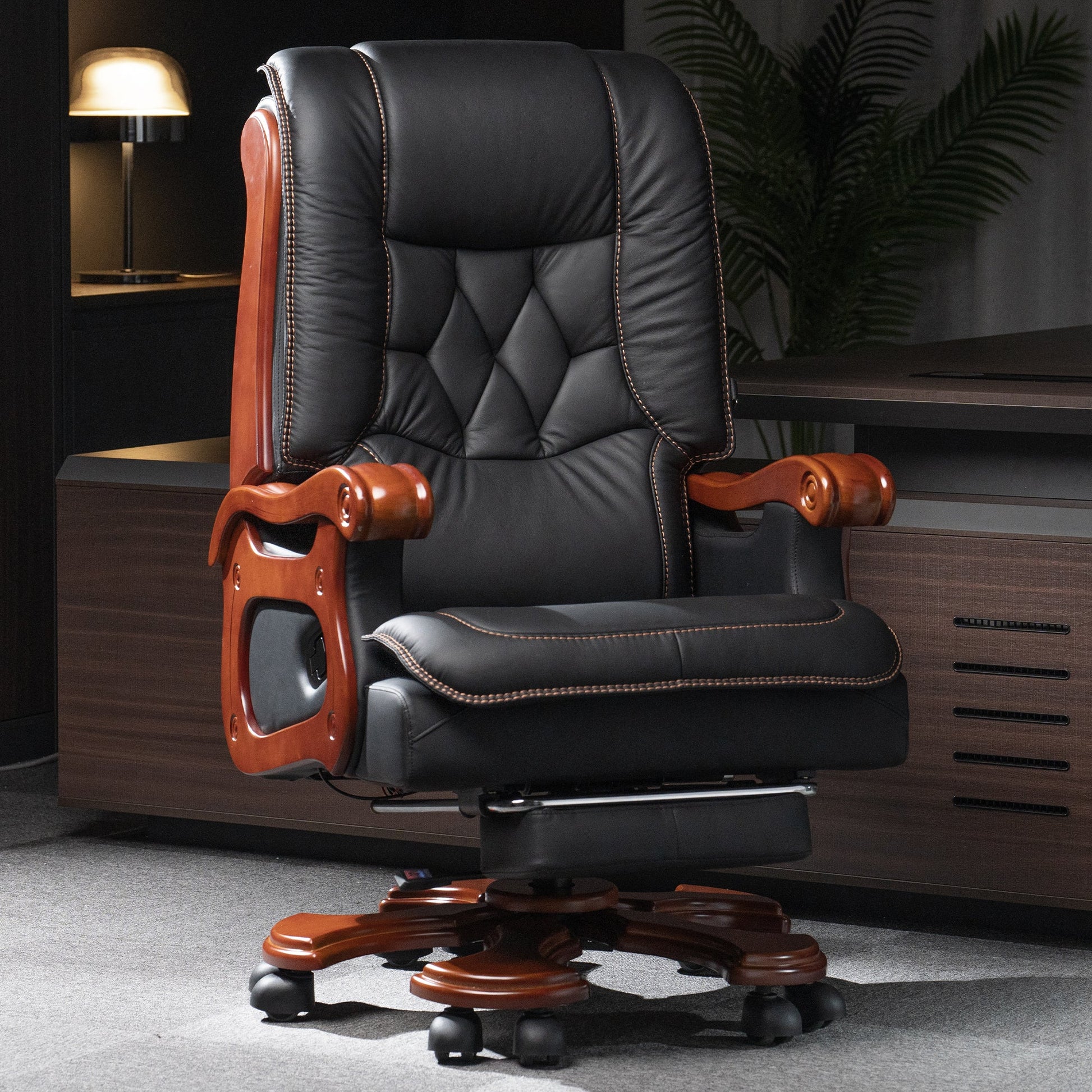 La poltrona massaggiante Evan è più grande del 25% rispetto a una normale poltrona direzionale. È inclinabile fino a 155°, ha elasticità di oscillazione regolabile e pedane retrattili. Inoltre, questa sedia da ufficio con schienale alto utilizza piastre, ruote e rotelle in PU liscio, con una capacità di carico di 550 libbre.